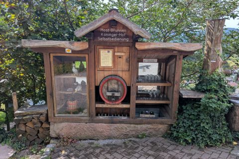 À intervalles réguliers, vous trouverez des petits abris de bois avec des bouteilles artisanales à disposition : kirsch, poire, prune, mais aussi des spécialités plus rares comme le schnaps de topinambour, de cerise aigre ou de coing.